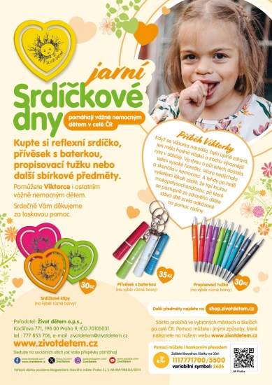 Jedná se o finanční pomoc nemocným dětem. Sbírka, která se uskuteční ve škole od 24. 3. do 28. 3. bude věnována Viktorce, která trpí mukopolysacharidózou. Přispět můžete formou nákupu různých předmětů v hodnotě od 30 Kč do 40 Kč nebo formou finančního příspěvku na účet uvedený na přiloženém plakátku.